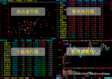 左下角是个股排行图,随着界面中的板块变化。个股排行图将板块监测界面的选股逻辑完美连贯在一起。从市场最活跃的热点来选择板块,从资金异动检查板块,通过操盘线判断板块趋势,在连过三关的热点板块中选择龙头个股,强势黑马再也不会溜走。四个相互独立、相互关联的图像,实时监控了最新最全的市场热点。