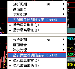 明日提示功能的开启/关闭切换:大盘/板块/个股操盘线界面下,右击鼠标,选择“显示操盘线明日提示”或选择“关闭操盘线明日提示”。