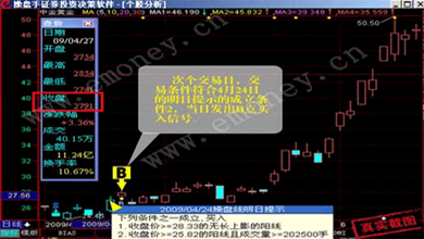 在大盘/板块/个股操盘线界面上,将鼠标移到单根K线上,即浮现出“明日提示”。