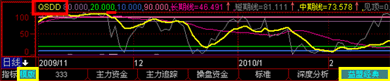 趋势顶底指标用4根不同颜色的线将指标区域分为了明显的5个部分。从上至下分别代表顶和底,在指标上方可以清楚看到各个不同区间的数值代表。指标从长、中、短 期趋势显示,便于用户明确股价当前走势的状况。