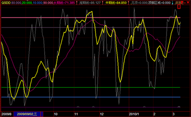 3) 3条曲线的位置,超买超卖现象类似摆动指标(20以下为超卖,80以上超买)。某些情况下有底部、抄底买点和风险区域信号提示,方便用户了解当前股价状态。