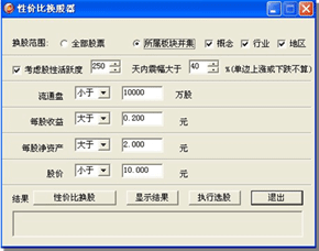 “性价比换股器”从股性和股价两个角度出发,选出可以替代当前个股的股票品种,为选股和操作开辟了一条全新思路。操作方式并不复杂,根据界面中的条件,设置自己想要的数据,即可点击“执行选股”,选完股之后,点击“显示结果”即可以分类报价形式显示选股结果。 “性价比换股器”中可以设置三个方面的内容:股性,包括股性活跃度、流通盘大小设定、每股收益、每股净资产四个方面;股价以及选股范围。用“性价比选股器”,换到股性更活跃,股票质量更高,价格更低的好股票!
