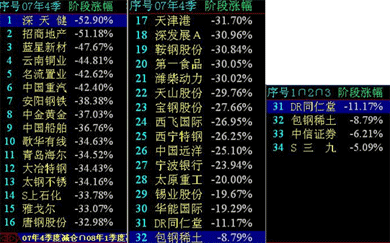 第3步:交集结果,发现34只“空军”统统被选出,打开板块监测(Ctrl+B),经过基金连续3个季度持续减仓,观察这些个股的阶段涨幅,以第二季度(也就是08.4.1-08.6.30)为例,竟然全部为负,这样一个基金“减仓炮弹”持续袭击的战场,相信后期反弹力度也会有一定的压力,像这种时期,介入需要慎重再慎重!