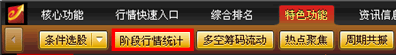 例如前期超跌的个股,在后期反弹时短线力度较大,想要找到这些超跌股需要翻遍5391只个股吗?只要使用 “阶段行情统计”功能,超跌股里轻松捡黄金! “阶段行情统计”能够通过对统计板块及起始日期的选择进行数据统计。在查看统计结果的同时,可以通过更换排序方式、顺序和倒序的切换进行更精准的个股选择,并且支持双击查看个股走势图。能够有效找出某一时期内,跌幅最大、横盘最久等各种需求的股票,为用户应对不同行情,进行不同选股操作提供了极好的支持!