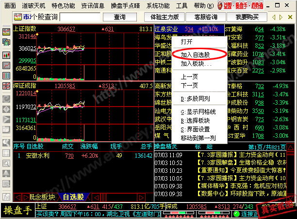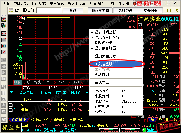 个股画面上,在走势图区域右击,选择“加入自选股”。
