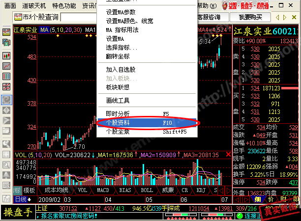 1、个股分时走势图或K线图界面右击鼠标,选择“个股资料”。